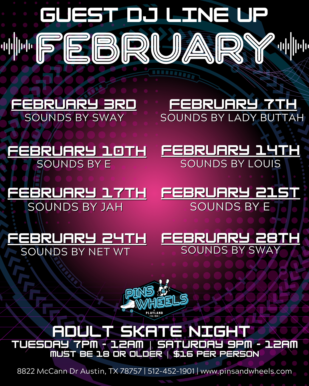 "Get ready to roll on one of the biggest and smoothest wood floors in the nation! Whether you're a first-time skater or a seasoned pro, there's plenty of space for everyone to glide, groove, and get lost in the vibrant atmosphere. From high-energy public skate sessions to unforgettable private events, and our legendary Adult Night, you're bound to make memories that will last a lifetime. The roller skating community is waiting for you — are you ready to roll with us?"